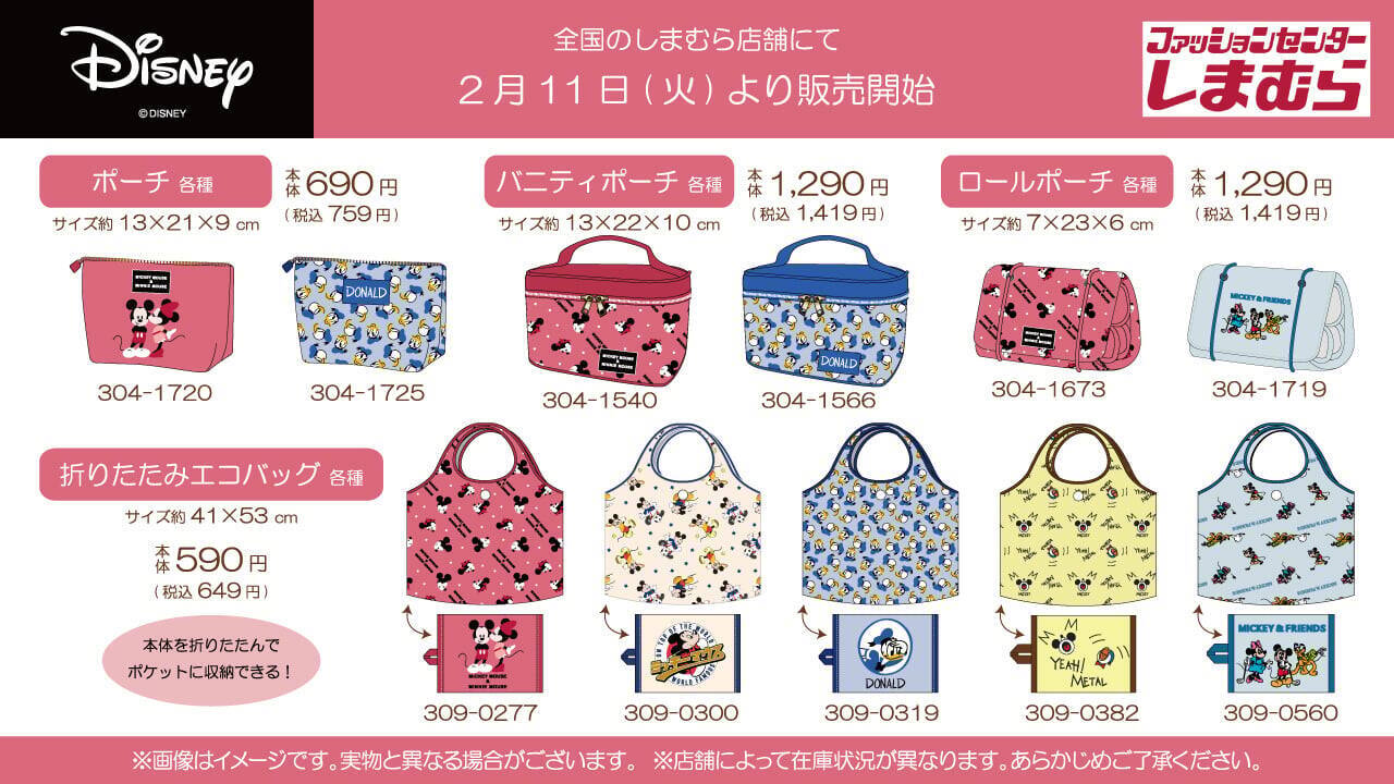 全国のしまむらでディズニーの新作バッグコレクションが登場!人気キャラクターたちと一緒におでかけを楽しめる、とってもキュートなアイテムが勢揃い。ミッキーマウスやドナルドダックの総柄デザインが魅力的なポーチは、本体690円(税込759円)からとお手頃価格!