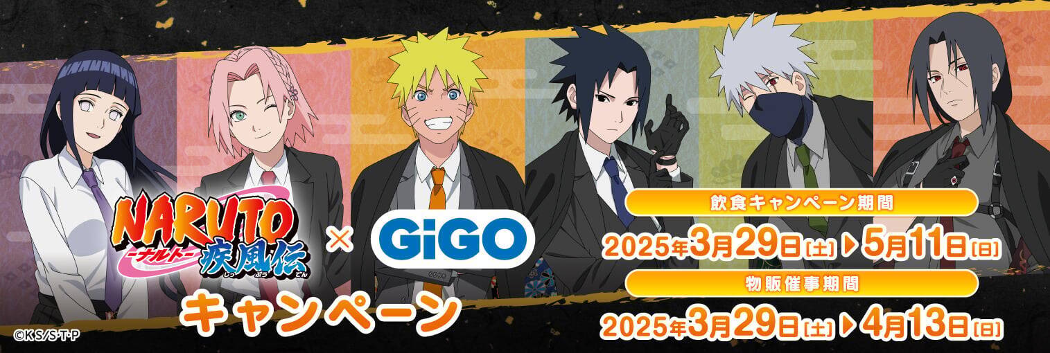 本キャンペーンでは、全国のGiGO店舗にて和スーツver.のキャラクターグッズが多数登場するほか、一部店舗では「NARUTO焼き」や特典付きドリンクも販売されます。オリジナルコースターなどの特典も用意されていますのでお楽しみに!忍びの世界観を楽しめる限定コラボをお見逃しなく。