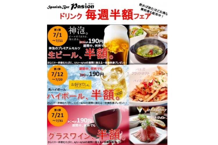 「Spanish Bar Pasion(スパニッシュバル パシオン)」3店舗から、「ドリンク毎週半額フェア」が、2019年7月1日(月)~7月31日(水)に開催になります。