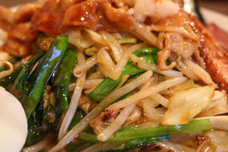 チャーシューの下には、もやし、ニラなどの野菜がてんこ盛り