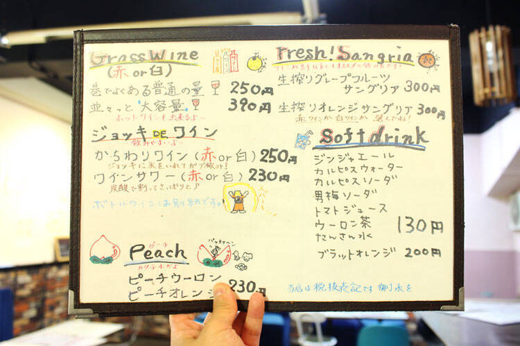 張り紙の宣言通り、お値段が破格です。ジョッキのかち割りワインが250円、なみなみっと大容量のワインが390円です。