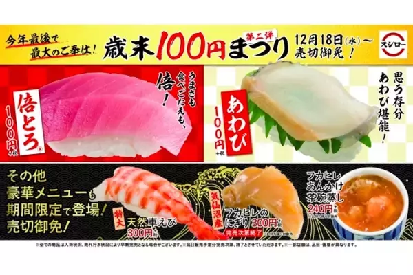 あきんどスシローから、「歳末100円まつり」第二弾が、2019年12月18日(水)より、全国のスシローで開催になります。