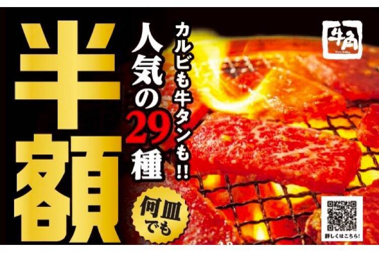 内容は、牛角自慢の47品を半額で提供するというもの。看板メニュー「牛角カルビ」や人気の定番メニュー「牛タン塩」「王様ハラミ」、また「生ビール(中)」などもラインナップしているようです。