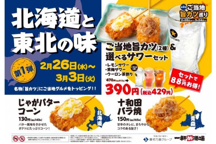 第一弾では「北海道・東北の味」をテーマに、北海道ならではの「じゃがバターコーン」、青森の「十和田バラ焼」、そしてこの2種と一緒にお酒が楽しめる「ご当地旨カツ(2種)&選べるサワーセット」が登場。