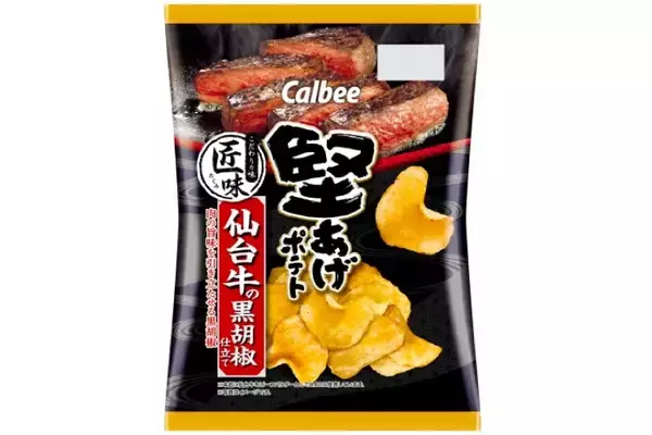 仙台牛ならではの"まろやかな風味・豊かな肉汁"からなる肉の旨味と、それを引き立たせる黒胡椒のアクセントが特徴。「堅あげポテト匠味」シリーズのコンセプトである"少し贅沢な和の味わい"に仕上げた、シンプルながら贅沢感のある一品に仕上がっているそう!!