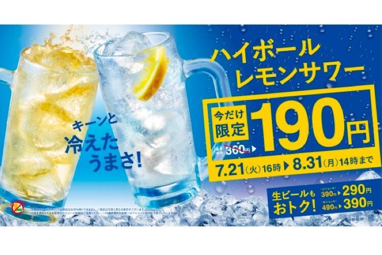 例えば、生ビール(小ジョッキ)は通常価格390円のところ特別価格290円、ハイボールは360円のところ190円、レモンサワーは360円のところ190円でラインナップ。また「お子様ランチ」を販売する店舗では、小学生以下のお子さんにソフトドリンク1杯をサービスする「ドリンクキャンペーン」も開催するとのことです。