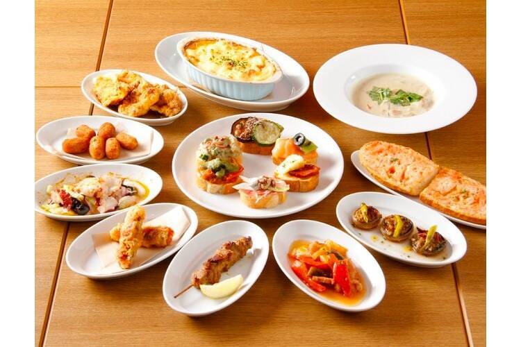 ピンチョスやタパスはもちろん、シェフこだわりのパエリアをはじめ、牛肉とフォワグラのロッシーニ風など、高級食材を使った料理も全て食べ放題なのが特徴。産地直送の「活ムール貝の白ワイン蒸し」や「雲丹出汁のしゃぶしゃぶ」など、「リザラン高田馬場店」オープン以来の人気メニューも食べ放題になっています。