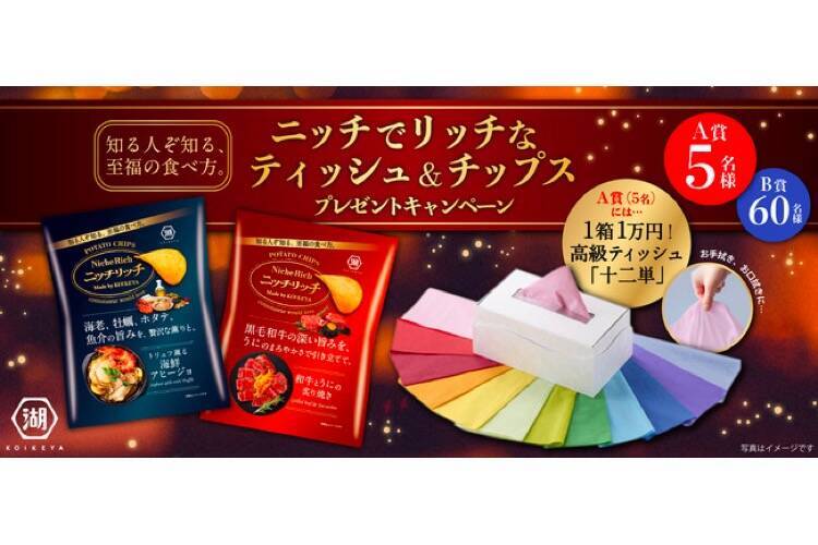 タイトルニッチでリッチなティッシュ&チップスプレゼントキャンペーン応募方法専用応募ページ(https://koikeya.co.jp/campaign/web_nicherichcp/)に、必要事項を入力。応募期間2021年2月3日(水)~2月28日(日)プレゼント賞品●A賞(5名)・高級ティッシュ「十二単ティッシュ」…1箱