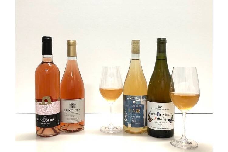 余市町リタファーム&ワイナリーから、このシーズンのみリリースとなる人気の銘柄オレンジ「十六夜」「樽デラ」、奥尻ワイナリーから、工場限定で販売中の「メルローロゼ」がラインナップ。また、千歳ワイナリーから、余市町木村農園産ピノ・ノワールをロゼに仕上げた美しい桜カラーの「ピノ・ノワールロゼ」がラインナップしています。