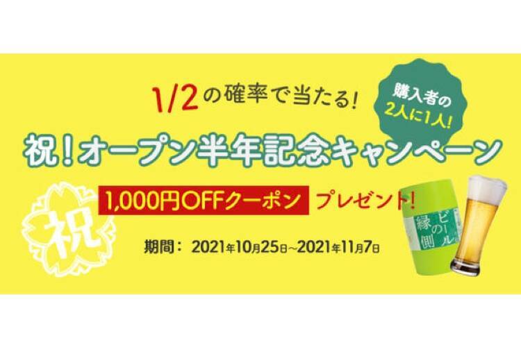 内容は、キャンペーン期間中に注文したお客さん(1回の注文で合計6,000円以上)の半数の方に、次回購入時に使える1,000円OFFクーポンを抽選でプレゼントするというもの。当選者には、対象期間終了後、ビールの縁側よりクーポンコードを記載したメールが届くのだそう。