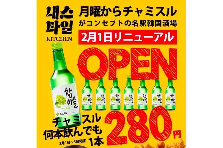 新たに、エンタメ空間を融合した新生ネスタルとして生まれ変わるという同店にて今回、お得な企画「チャミスル祭」の開催が決定。期間中は、チャミスルボトルを"何時でも何本飲んでも"1杯280円(税込308円)で味わえるキャンペーンを実施しています。