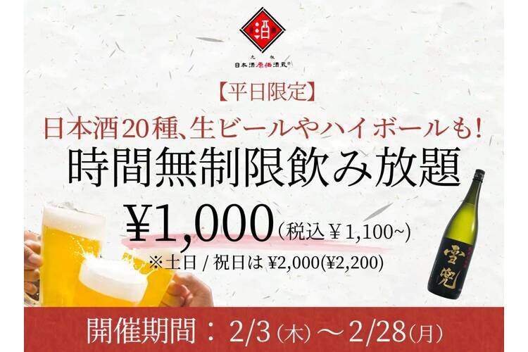 日本酒原価酒蔵から、時間無制限飲み放題¥1,000(税込¥1,100)~が、2022年2月3日(木)~2月28日(月)にて全店舗で開催になります。