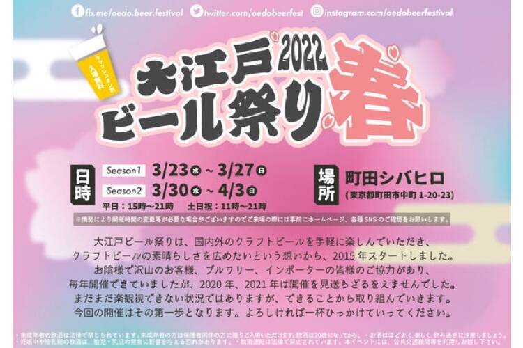 「大江戸ビール祭り実行委員会」から、「大江戸ビール祭り2022春」が、2022年3月23日(水)~4月3日(日)の期間、町田シバヒロで開催になります。