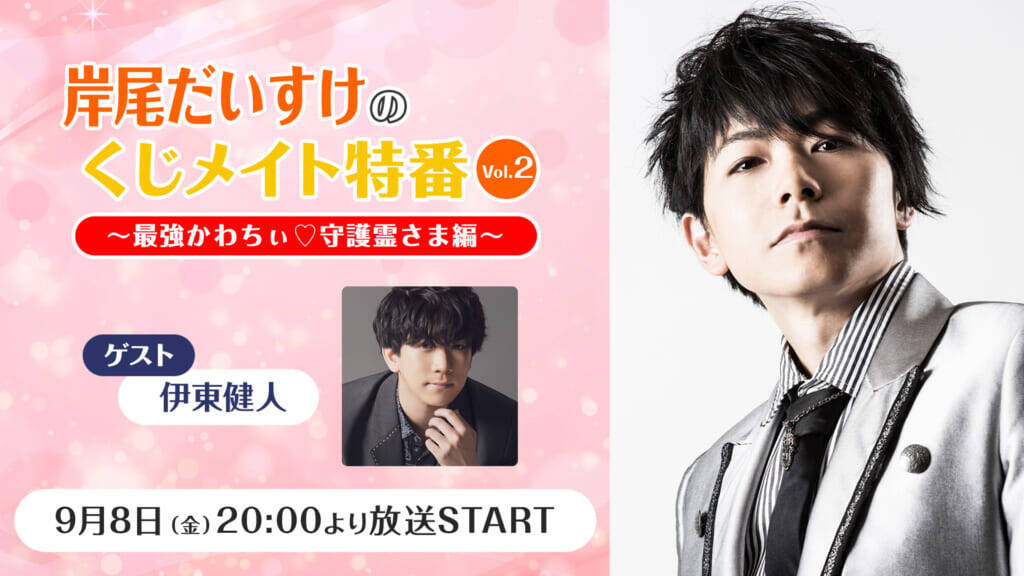 9月8日(金)放送の「岸尾だいすけのくじメイト特番Vol.2~最強かわちぃ♥守護霊さま編 ~#1」は、アニメイトのオンラインくじサービス「くじメイト」において、岸尾だいすけさんのくじメイト第2弾が販売となったことを記念して行われる特別番組です。