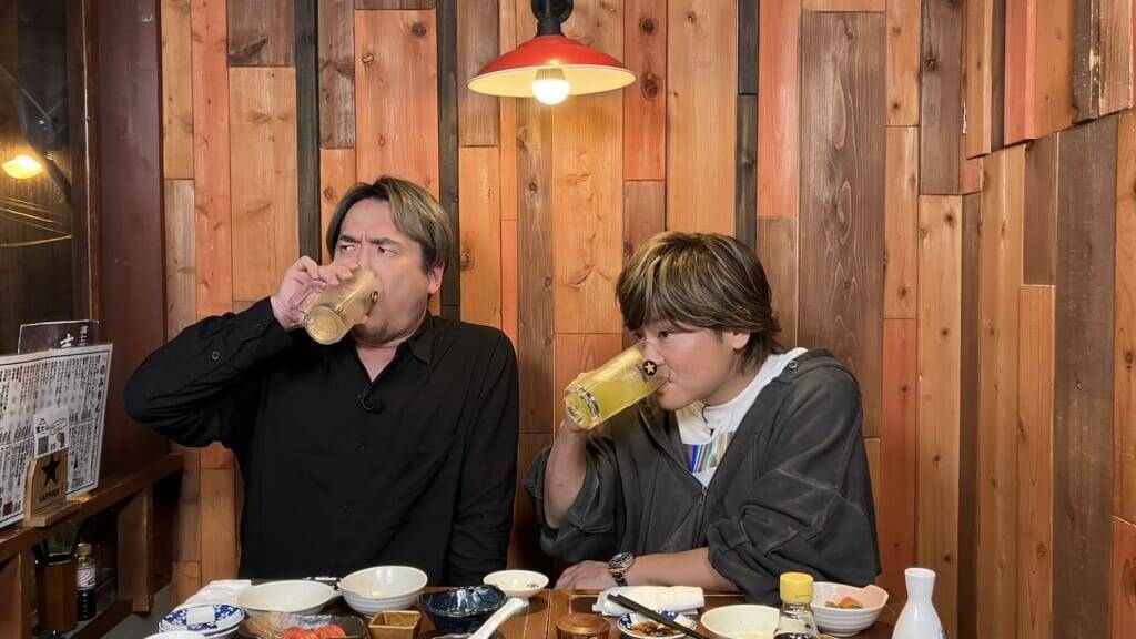 安元洋貴さんをゲストに迎えた本放送。早速乾杯し、年末に放送された“夜あそび忘年会”での裏話や、とにかく陽気だという安元さんの父親の話まで、弾丸トークを繰り広げていきます。