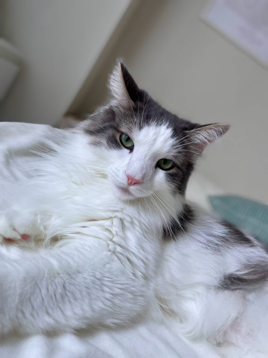 寝室の色味がホワイト×グリーンなのですが、むくの瞳もグリーンなので寝室でまったりしてると絵になるむく。