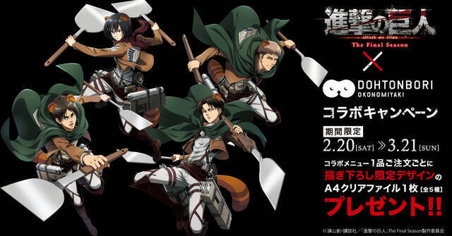株式会社道とん堀が運営する「お好み焼 道とん堀」は、2月20日(土)から人気TVアニメ「進撃の巨人 The Final Season」とコラボレーションしたキャンペーンを全店で実施します。『進撃の巨人 The Final Season』×「道とん堀」