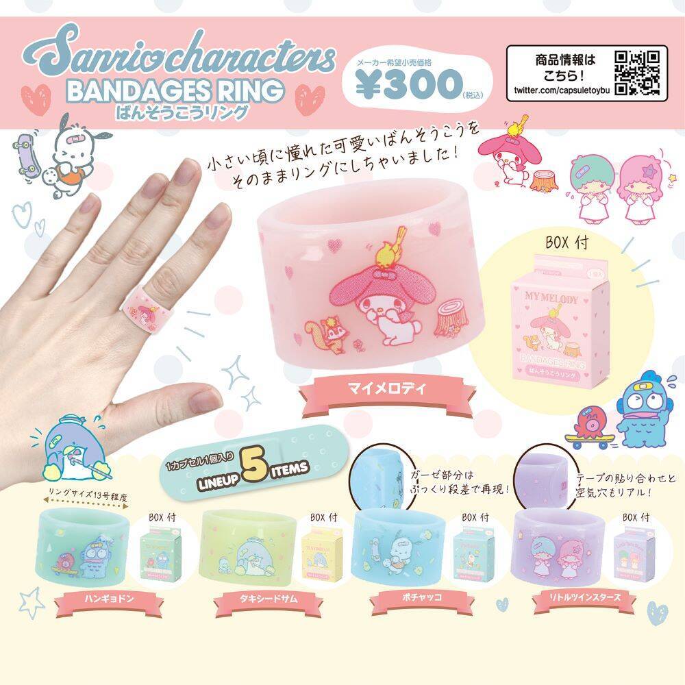 ばんそうこうリング第1弾として、マイメロディ、ハンギョドン、タキシードサム、ポチャッコ、リトルツインスターズの5種類のデザインが登場。