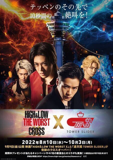 シリーズ累計観客動員556万人・興行収入 78億円突破、男たちの友情と熱き戦いを様々なメディアで描く「HiGH&LOW」シリーズと、累計8000万部突破・不良漫画の金字塔「クローズ」「WORST」(原作・髙橋ヒロシ)の、 2大最強コンテンツ・クロスオーバー映画『HIGH&LOW THE WORST』の続編『HiGH&LOW THE WORST X』(読み:「X」=クロス)がいよいよ 2022年9月9日(金)に大阪ステーションシティシネマ他にて全国公開いたします。この度、大阪のシンボル通天閣にて話題沸騰中の新アトラクション「通天閣 TOWER SLIDER」とのコラボが決定いたしました!!