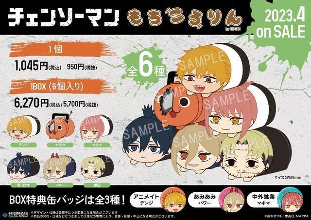 デンジ、ポチタ、マキマ、早川アキ、パワー、岸辺の全6種をラインナップし、対象店舗にて予約・購入すると店舗別のBOX購入特典缶バッジが付属。