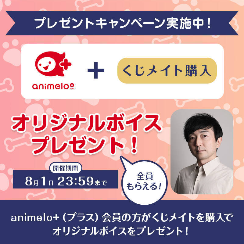 そのほか、発売中のくじメイト『野島裕史のくじメイト~犬系彼氏に癒される暮らし編~』『野島健児のくじメイト~猫系彼氏に翻弄される暮らし編~』では、ニコニコチャンネル「animelo+」会員限定でオリジナルボイスがもらえるキャンペーンを実施中。