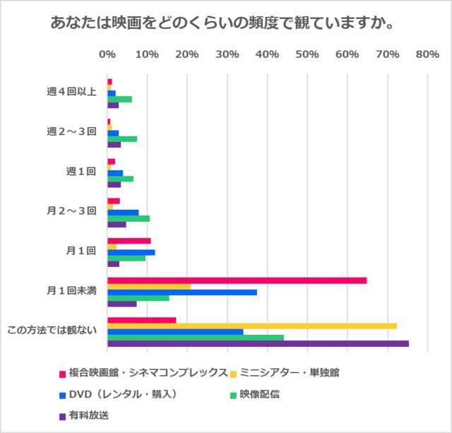 月1回以上は映画を見ると回答した中で最も多かった鑑賞スタイルは、上位から「映像配信」(40.5%)、「DVD」(28.7%)、「映画館・シネコン」(18.0%)、「有料放送」(17.4%)、「ミニシアター」(6.9%)となり、身近で手軽な鑑賞スタイルの頻度が高いことが分かりました。