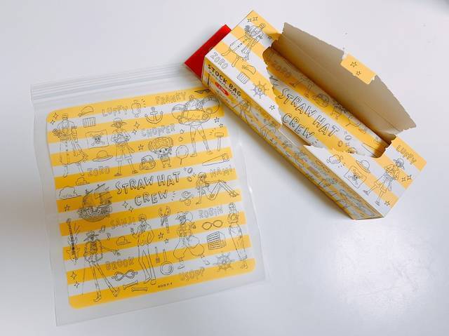 お料理に小物の整理整頓に、何かと使える万能なストックバッグ。黄色のボーダーの上に麦わらの一味が並ぶ、明るいデザインに気分も上がります♪