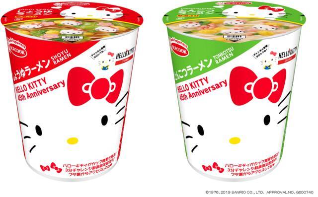 2019年10月21日より、エースコック株式会社から、株式会社サンリオの『ハローキティ』とコラボレーションした「ハローキティ45周年お祝いカップ麺 しょうゆラーメン/とんこつラーメン」が新発売です!ハローキティ45周年お祝いカップ麺 画像