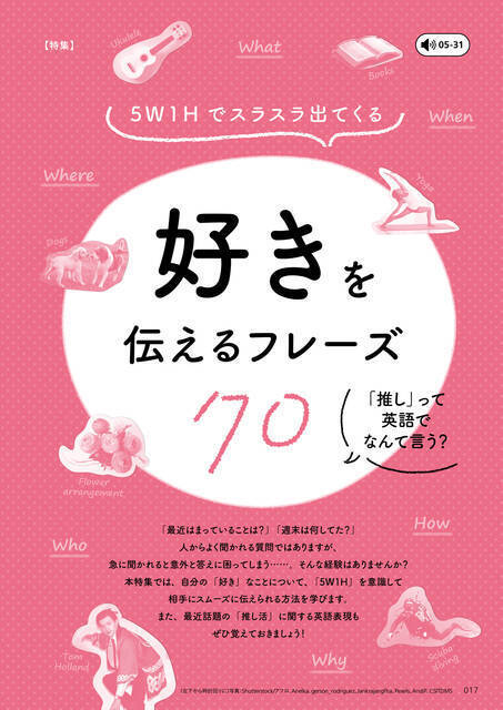本企画では、When(いつ) 、Where(どこで)、Who(だれが)、What)(なにを)、Why(なぜ)、How(どのように)の「5W1H」を意識することで英語でもスムーズに"好き"を伝えられるフレーズを特集。 日常会話に頻出するトピックである「趣味」について語る、さまざまな角度の英語表現が掲載されており、「ハマっています」や「興味があります」など、細かなニュアンスの違いを網羅しているほか、「いつも」や「大抵」などの頻度を表す単語、「推し」などの推し活用語についての英語表現などを紹介します。