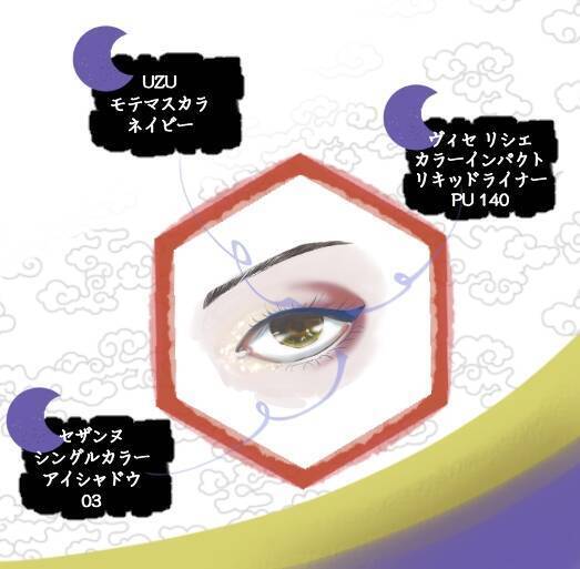 殺生丸のイメージカラーは、ネイビー、パープル、イエロー、レッドですが、この色味をアイシャドウだけで表現してしまうと、ごちゃつく上にメイクが崩れたときに大惨事。