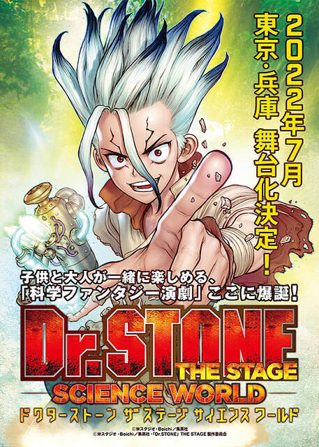 『Dr.STONE』初の舞台化が決定しました!タイトルは『Dr.STONE』THE STAGE ~SCIENCE WORLD~。2022年7月に東京と兵庫にて上演します。原作は、稲垣理一郎さん・Boichiさんにより「週刊少年ジャンプ」(集英社刊)にて2017年から連載され、2022年3月、本誌14号にて完結を迎えた大人気少年漫画です。