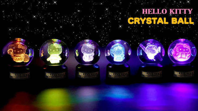 今回の商品は、クリスタル球の中に描かれた縁起物である招き猫、だるま、犬はりこ、七福神、信楽たぬきなどに変身した立体的なハローキティが、台座に仕込まれたLEDによって幻想的に光ります。台座ランプの上にボールを置くと、LEDが順次に光り色が移り変わっていきます。その光がボールの中のハローキティに反射し光り、ハローキティが浮いているようにも見え、とても幻想的です。