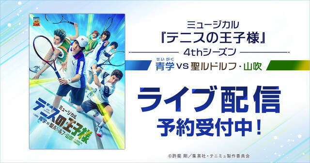ミュージカル『テニスの王子様』4thシーズンでは、エリート集団である聖ルドルフ学院中学校や実力派の名門校・山吹中学校が揃う都大会を舞台に、主人公・越前リョーマや不二周介の弟・裕太、亜久津仁など多くのキャラクターがテニスでぶつかり合います。 本配信ではライブ配信としてリアルタイムでの視聴が可能なほか、それぞれの終了日程まで何度でも見逃し配信が楽しめます。 さらに、それぞれの日程ごとに青学や聖ルドルフ、山吹にフォーカスしたスイッチング映像や全景映像など異なるアングルが用意されているとのことです。 配信を予定している公演、各日程の映像は以下のとおり。東京公演 2022年7月5日(火)17:30【初日:スイッチング映像】また、PS5/PS4 Pro/PS4/Android TV/Amazon Fire TV端末を使用してテレビでのライブ配信の視聴も可能。各プラットフォームでの視聴方法は公式サイト下部のQ&Aにて確認できます。 配信チケットの価格は、スイッチング映像が税込3700円、全景映像が税込2800円となっています。 リリース全文は以下のとおり。