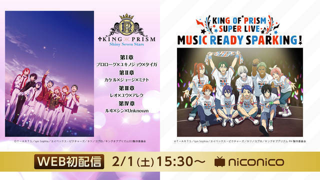 2年4カ月ぶりとなる『キンプリ』のライブイベント「KING OF PRISM SUPER LIVE Shiny Seven Stars! 」の2/2(日)開催を記念して、2019年より放映された「劇場版KING OF PRISM -Shiny Seven Stars-」全4章、ならびに、シリーズ作品初の単独ライブとして2017年に開催された「KING OF PRISM SUPER LIVE MUSIC READY SPARKING!」が、2/1(土)にニコニコ生放送にて一挙放送されます。劇場版、ライブ映像ともにWEB初配信となります。