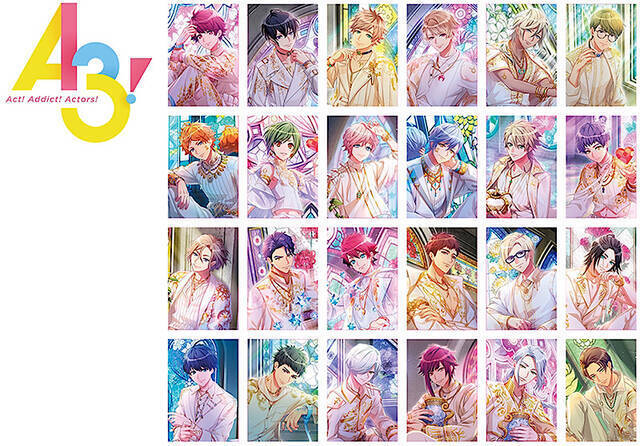 開催内容:期間中、『A3!』関連のキャラクターグッズ・書籍をご購入1,100円(税込)毎、またはCD・Blu-ray・DVDをご購入1点毎に、特典「ラメ入りキラキラミニカード(全24種)」をランダムで1枚プレゼントいたします。
