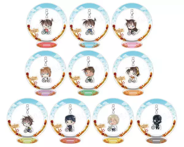 江戸川コナン、工藤新一、毛利蘭、灰原哀、服部平次、遠山和葉、世良真純、赤井秀一、安室透、犯人、全10キャラクターのオリジナルデフォルメイラストを使用した各商品が登場!さらに2017年の“AGF”でも好評を博した「星」をテーマにした、江戸川コナン、工藤新一、灰原哀、服部平次、赤井秀一、安室透、怪盗キッドの描き下ろしイラストを使用した新規商品も!名探偵コナン ブラインドゆれるミニアクリルスタンド 秋Ver.(全10種)