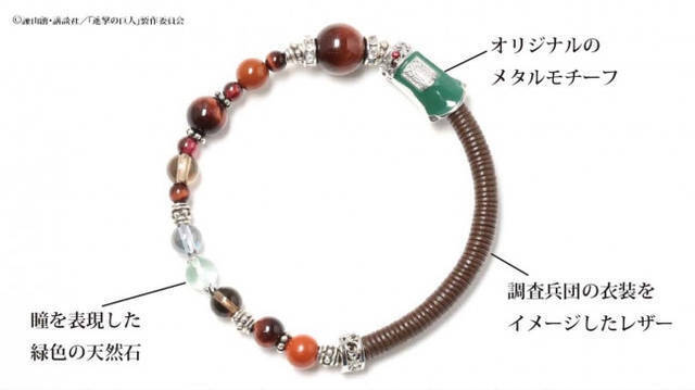 エレンやアルミン、リヴァイなど調査兵団のメンバーをそれぞれモチーフにしたブスレットです。髪や瞳の色をイメージした天然石が使用されており、ぱっと見アニメグッズと気づかないデザインも魅力。
