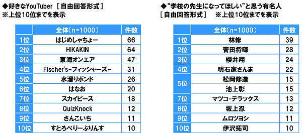 「中高生が思い描く将来についての意識調査」にて"好きなYouTuber"をリサーチ。はじめしゃちょーさん、HIKAKINさん、東海オンエアさんらがランクインしました♪