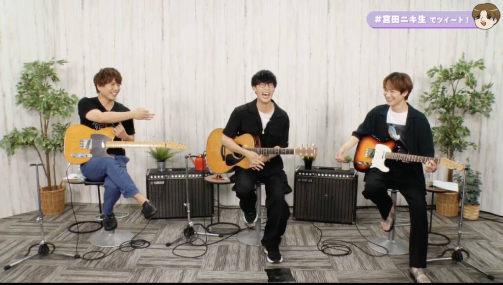 宮田さんとプライベートでも親交があり、頻繁にX(旧Twitter)にてやり取りする姿を見せている仲村さんは、宮田さんと一緒にギターを買いに行ったことを明かした。オーイシさんは宮田さんと楽曲制作についてのトークで盛り上がったほか、ギターを教える場面も。