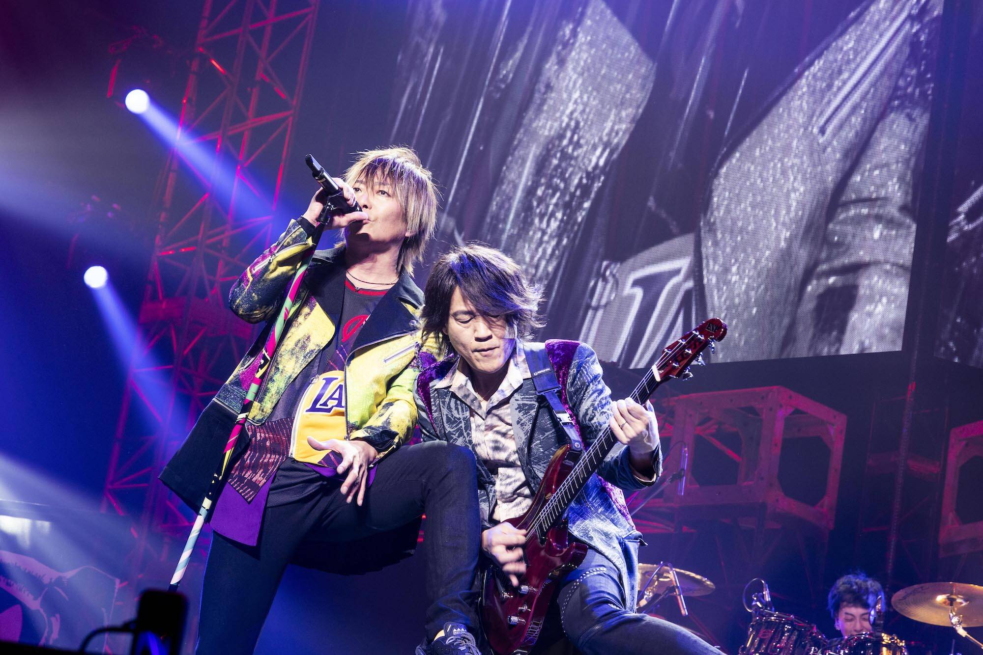 華々しいアウトロが終わり、これでアニメタイアップ全 32 曲をついに完走だ!と思われたその時。 SHiN のドラムが聞き覚えのあるリズムを刻み、 KISHOW が「 Go For It! Go For It! 」と声を重ね、 e ZUKA がおなじみのリフを弾き始める。オープニングナンバーだった「 Go For It! 」で残されていた「 I.G.P.X 」のコール レスポンスを、最後のお楽しみとして取っておい てくれたのだ。 10 回以上のコールを重ね、 ラストは KISHOW が e ZUKAと肩を組んでマイクを分け合う場面も! 空気を切り裂く KISHOW の “Rock You のシャウトが、日本武道館の隅々まで響き渡った。
