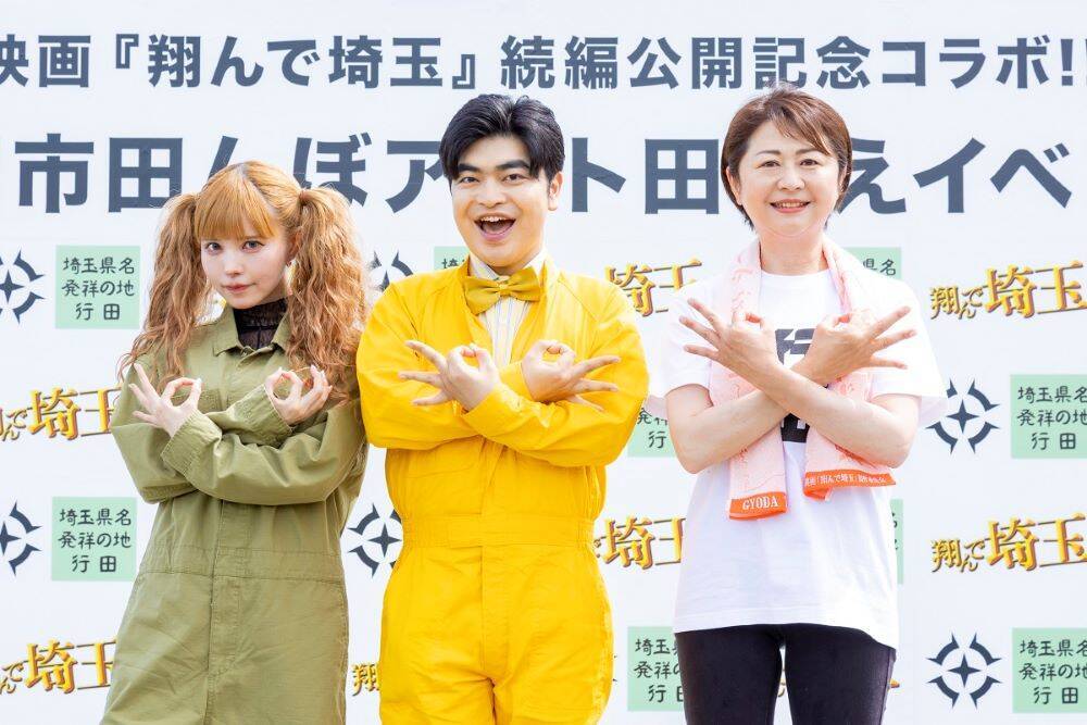 先日、前作からの続投が発表され大いに話題となった2人。加藤は「『翔んで埼玉』の魅力と行田市のいいところをしっかりアピール出来るように頑張ります!」と気合は十分、一方で益若は「いよいよ宣伝スタート!という一発目のイベントでまさかの田んぼファッション?!埼玉だな~」というコメントに開始早々会場は笑いの渦に。