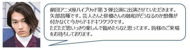 お笑いユニット“劇団アニメ座”が舞台俳優とタッグを組んだ 「劇団アニメ座ハイブリッド」第3 弾の開催が決定! 第1 弾出演の田中稔彦さん、第1・2 弾出演の寿里さんに加え、初参加となる矢部昌暉さん(DISH//)、長江崚行さんが芸人との新たなコラボを生み出します。