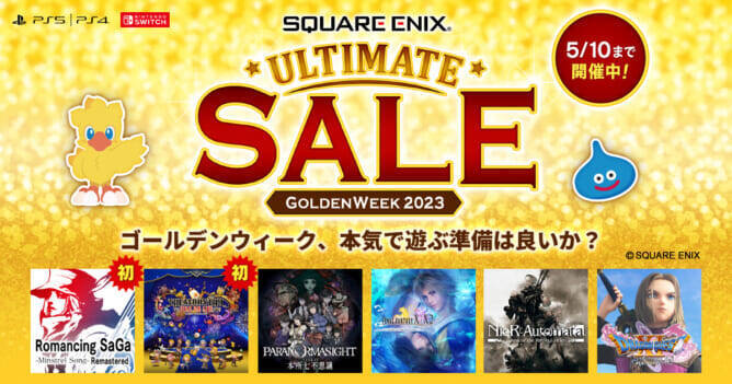 株式会社スクウェア・エニックスは、ニンテンドーe ショップ、PlayStationStoreにてダウンロード版タイトルのセール「スクウェア・エニックス アルティメットセール GOLDENWEEK 2023」を開催すると発表した。セール期間は5月10日までとなっている。
