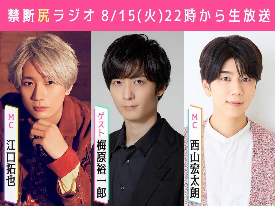 8月15日22時より放送されるニコニコ生放送番組『江口拓也・西山宏太朗 禁断尻ラジオ』に梅原裕一郎さんがゲスト出演することが発表された。
