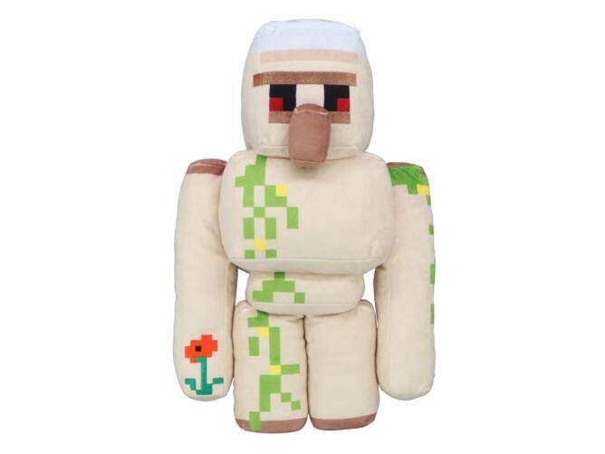 村人を守るアイアンゴーレムがぬいぐるみとなった「ポピーを持ったアイアンゴーレムBIGぬいぐるみ」。村人のぬいぐるみと一緒に飾って楽しめる。全長約40cm。