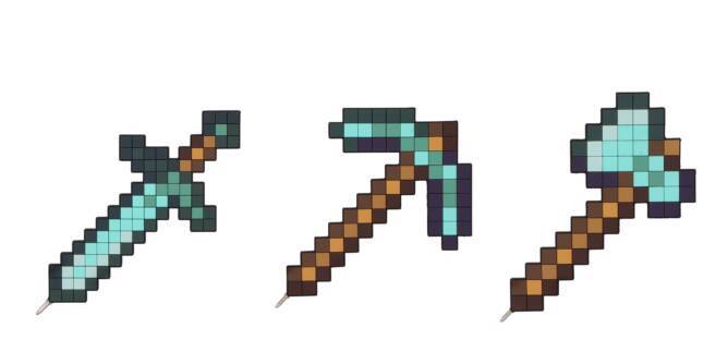 ダイヤモンドの剣、ダイヤモンドのツルハシ、ダイヤモンドの斧のペンをデザインした「ラバー道具ペン」。全3種、全長12cm。