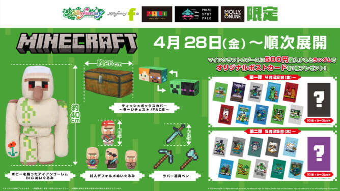 『マインクラフト』の「村」にフォーカスしたプライズゲーム用の景品アイテムは、アミューズメント施設やオンラインクレーンゲーム「モーリーオンライン」にて、4月28日(金)より順次展開予定だ。