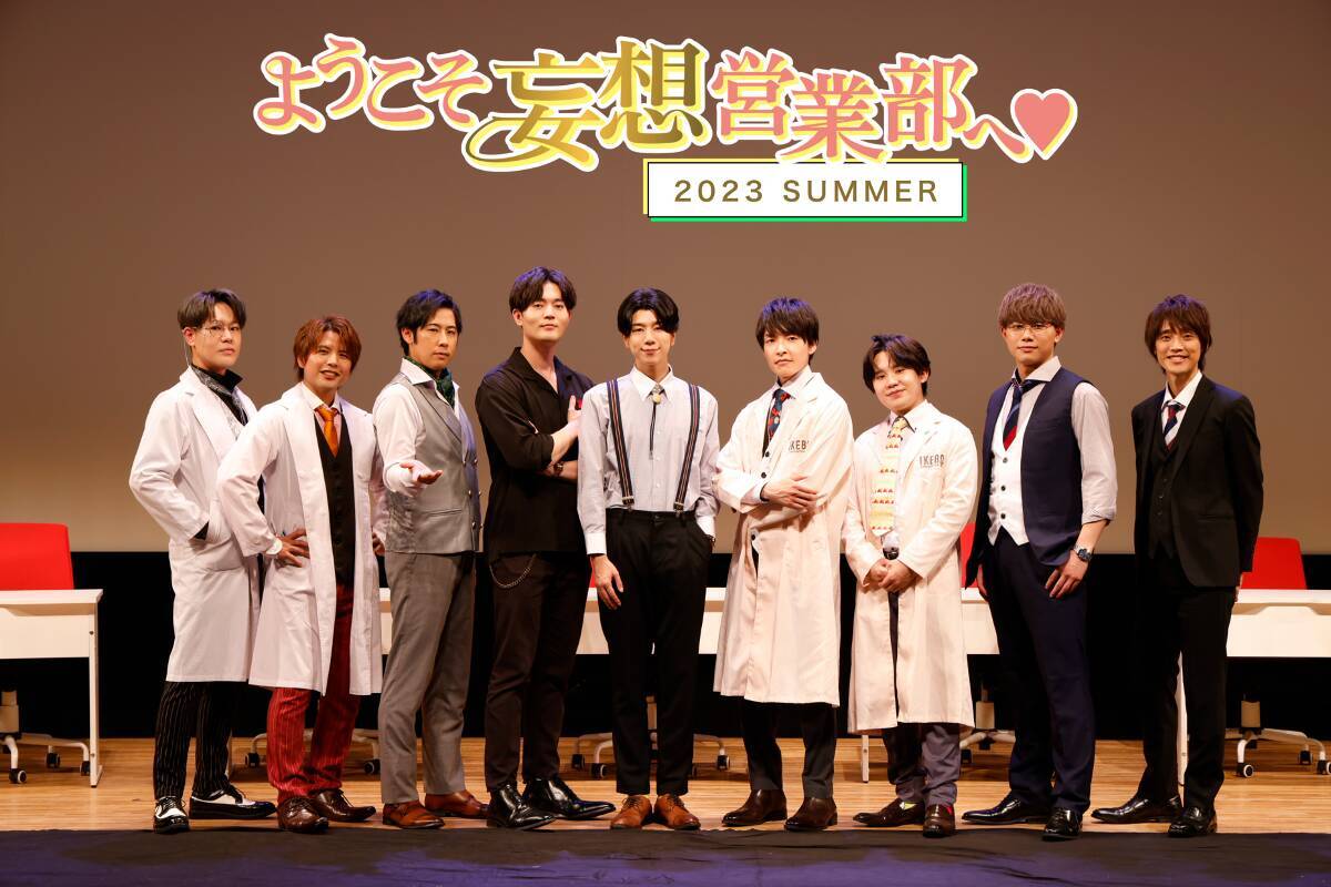 7月2日(日)に東京・福生市民会館 大ホール(もくせいホール)にて『ようこそ妄想営業部へ♥2023 SUMMER』が第1部、第2部にわたって開催。西山コータロー役・西山宏太朗さん、駒田ワタル役・駒田航さん、シンイチロー・神尾役・神尾晋一郎さん、仲村シューゴ役・仲村宗悟さん、田丸アツシ役・田丸篤志さん、葉山ショータ役・葉山翔太さん、白井ユースケ役・白井悠介さん、そして本イベントから初参加となる竹内エージ役・竹内栄治さんが出演し、“妄想力”を爆発させました。イケボ商事社長役として森久保祥太郎さんの出演も発表され、観客を大きく沸かせたイベントの様子を【第1部】を中心にレポートします。