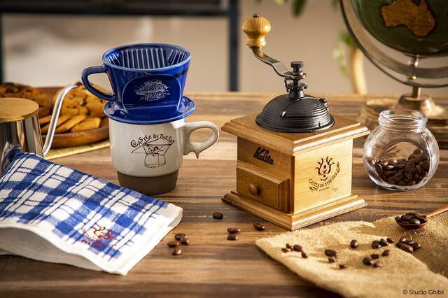 手挽きならではの、コーヒー豆を挽く独特の感触が楽しめる「手挽きドームミル」、シータとパズー、ドーラ一家が手を振りあう様子を描いた「波佐見焼スタックマグ」、飛び立つラピュタ城が描かれ、飛行石をイメージした藍色の「波佐見焼ドリッパー101」と「蚊帳生地 八重ふきん」など、ゆったりとしたコーヒータイムを「天空の城ラピュタ」一色でお楽しみいただけます。