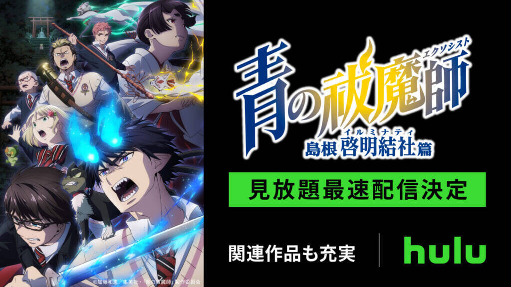 この度、そんな 7 年ぶりの大人気アニメシリーズ最新作『⻘の祓魔師 島根啓明結社篇』を地上波放送終了後から Hulu にて“見放題最速”で先行配信することが決定しました!